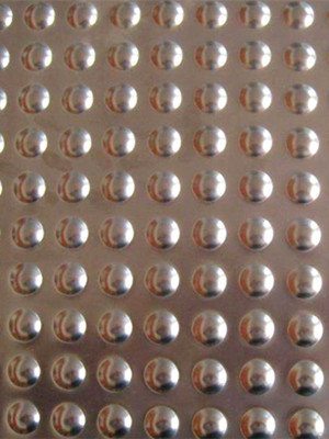 在平面的沖孔板上沖壓出凸起的鼓包或者魚眼睛樣式的孔,在接觸時(shí)增大了與板面的摩擦幾率,它不像鱷魚嘴鋸齒孔給人的鋒利的樣子,防滑效果可能沒有那種鋸齒孔要好,但是滿足一般防滑性要求不太高的平臺(tái)場(chǎng)所還是可以的,經(jīng)過處理防腐性良好。